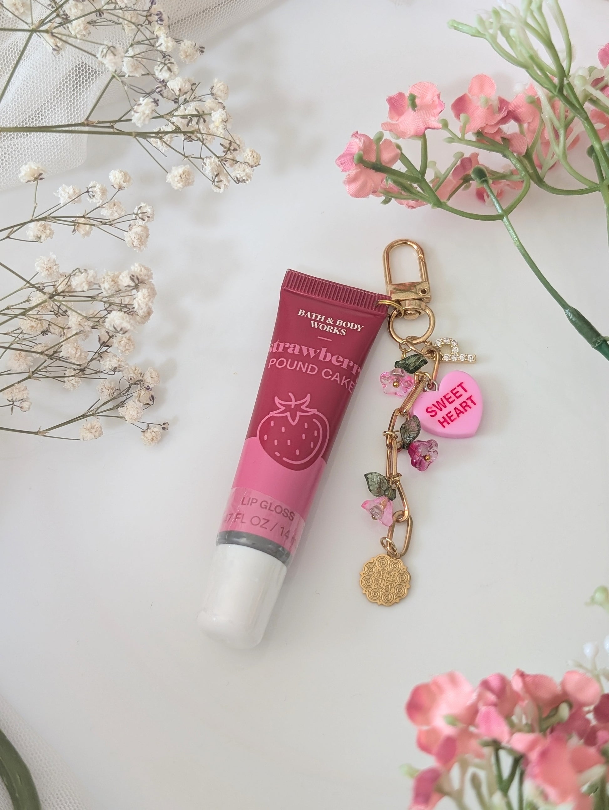 Pink Valentine Strawberry Initial Lip Gloss Keychain